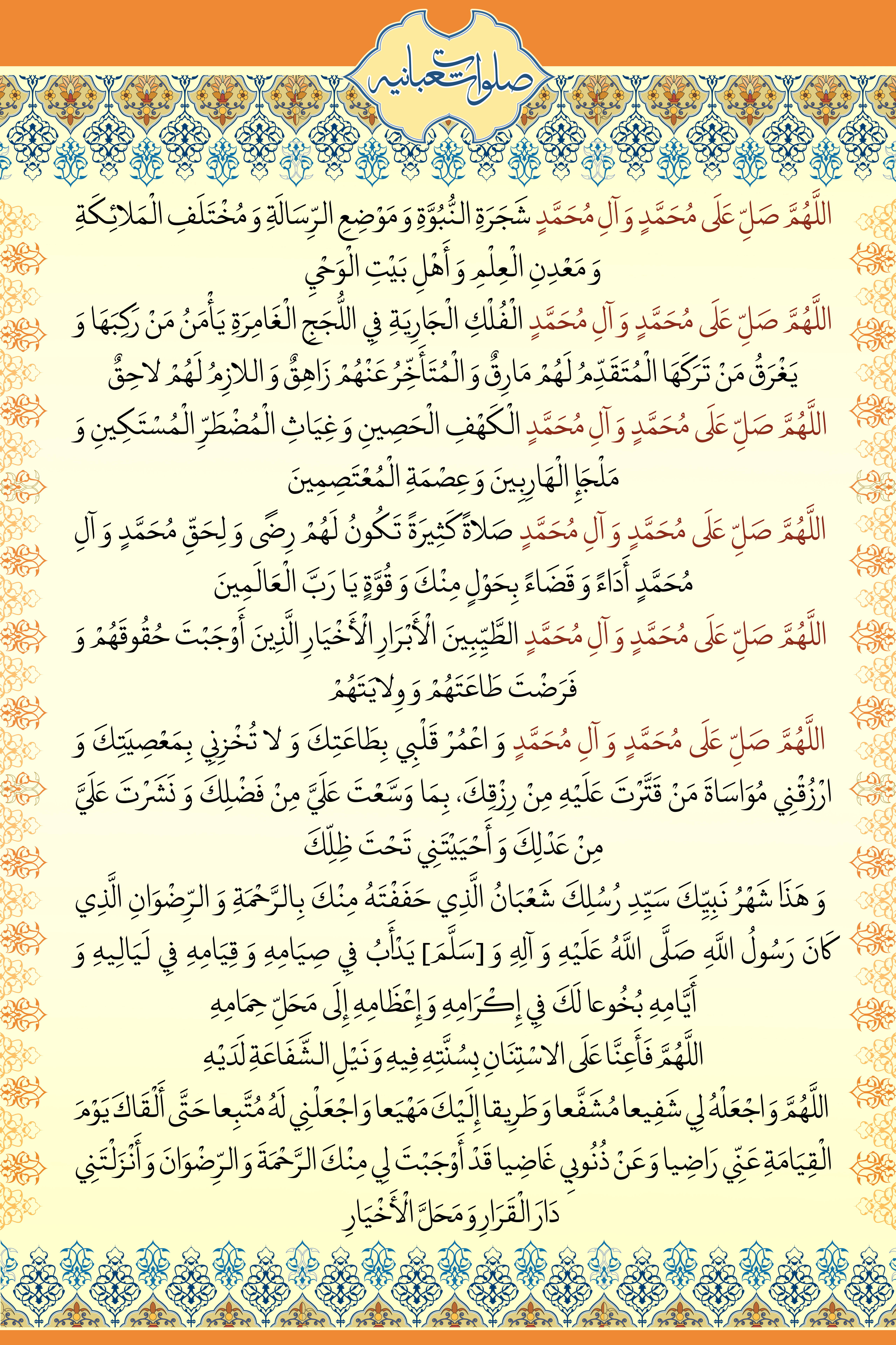 اللَّهُمَّ صَلِّ عَلَى مُحَمَّدٍ وَ آلِ مُحَمَّدٍ شَجَرَةِ النُّبُوَّةِ وَ مَوْضِعِ الرِّسَالَةِ وَ مُخْتَلَفِ الْمَلائِکَةِ وَ مَعْدِنِ الْعِلْمِ وَ أَهْلِ بَیْتِ الْوَحْیِ اللَّهُمَّ صَلِّ عَلَى مُحَمَّدٍ وَ آلِ مُحَمَّدٍ الْفُلْکِ الْجَارِیَةِ فِی اللُّجَجِ الْغَامِرَةِ یَأْمَنُ مَنْ رَکِبَهَا وَ یَغْرَقُ مَنْ تَرَکَهَا الْمُتَقَدِّمُ لَهُمْ مَارِقٌ وَ الْمُتَأَخِّرُ عَنْهُمْ زَاهِقٌ وَ اللازِمُ لَهُمْ لاحِقٌ اللَّهُمَّ صَلِّ عَلَى مُحَمَّدٍ وَ آلِ مُحَمَّدٍ الْکَهْفِ الْحَصِینِ وَ غِیَاثِ الْمُضْطَرِّ الْمُسْتَکِینِ وَ مَلْجَإِ الْهَارِبِینَ وَ عِصْمَةِ الْمُعْتَصِمِینَ اللَّهُمَّ صَلِّ عَلَى مُحَمَّدٍ وَ آلِ مُحَمَّدٍ صَلاةً کَثِیرَةً تَکُونُ لَهُمْ رِضًى وَ لِحَقِّ مُحَمَّدٍ وَ آلِ مُحَمَّدٍ أَدَاءً وَ قَضَاءً بِحَوْلٍ مِنْکَ وَ قُوَّةٍ یَا رَبَّ الْعَالَمِینَ اللَّهُمَّ صَلِّ عَلَى مُحَمَّدٍ وَ آلِ مُحَمَّدٍ الطَّیِّبِینَ الْأَبْرَارِ الْأَخْیَارِ الَّذِینَ أَوْجَبْتَ حُقُوقَهُمْ وَ فَرَضْتَ طَاعَتَهُمْ وَ وِلایَتَهُمْ اللَّهُمَّ صَلِّ عَلَى مُحَمَّدٍ وَ آلِ مُحَمَّدٍ وَ اعْمُرْ قَلْبِی بِطَاعَتِکَ وَ لا تُخْزِنِی بِمَعْصِیَتِکَ وَ ارْزُقْنِی مُوَاسَاةَ مَنْ قَتَّرْتَ عَلَیْهِ مِنْ رِزْقِکَ، بِمَا وَسَّعْتَ عَلَیَّ مِنْ فَضْلِکَ وَ نَشَرْتَ عَلَیَّ مِنْ عَدْلِکَ وَ أَحْیَیْتَنِی تَحْتَ ظِلِّکَ وَ هَذَا شَهْرُ نَبِیِّکَ سَیِّدِ رُسُلِکَ شَعْبَانُ الَّذِی حَفَفْتَهُ مِنْکَ بِالرَّحْمَةِ وَ الرِّضْوَانِ الَّذِی کَانَ رَسُولُ اللَّهِ صَلَّى اللَّهُ عَلَیْهِ وَ آلِهِ وَ [سَلَّمَ‏] یَدْأَبُ فِی صِیَامِهِ وَ قِیَامِهِ فِی لَیَالِیهِ وَ أَیَّامِهِ بُخُوعا لَکَ فِی إِکْرَامِهِ وَ إِعْظَامِهِ إِلَى مَحَلِّ حِمَامِهِ اللَّهُمَّ فَأَعِنَّا عَلَى الاسْتِنَانِ بِسُنَّتِهِ فِیهِ وَ نَیْلِ الشَّفَاعَةِ لَدَیْهِ اللَّهُمَّ وَ اجْعَلْهُ لِی شَفِیعا مُشَفَّعا وَ طَرِیقا إِلَیْکَ مَهْیَعا وَ اجْعَلْنِی لَهُ مُتَّبِعا حَتَّى أَلْقَاکَ یَوْمَ الْقِیَامَةِ عَنِّی رَاضِیا وَ عَنْ ذُنُوبِی غَاضِیا قَدْ أَوْجَبْتَ لِی مِنْکَ الرَّحْمَةَ وَ الرِّضْوَانَ وَ أَنْزَلْتَنِی دَارَ الْقَرَارِ وَ مَحَلَّ الْأَخْیَارِ