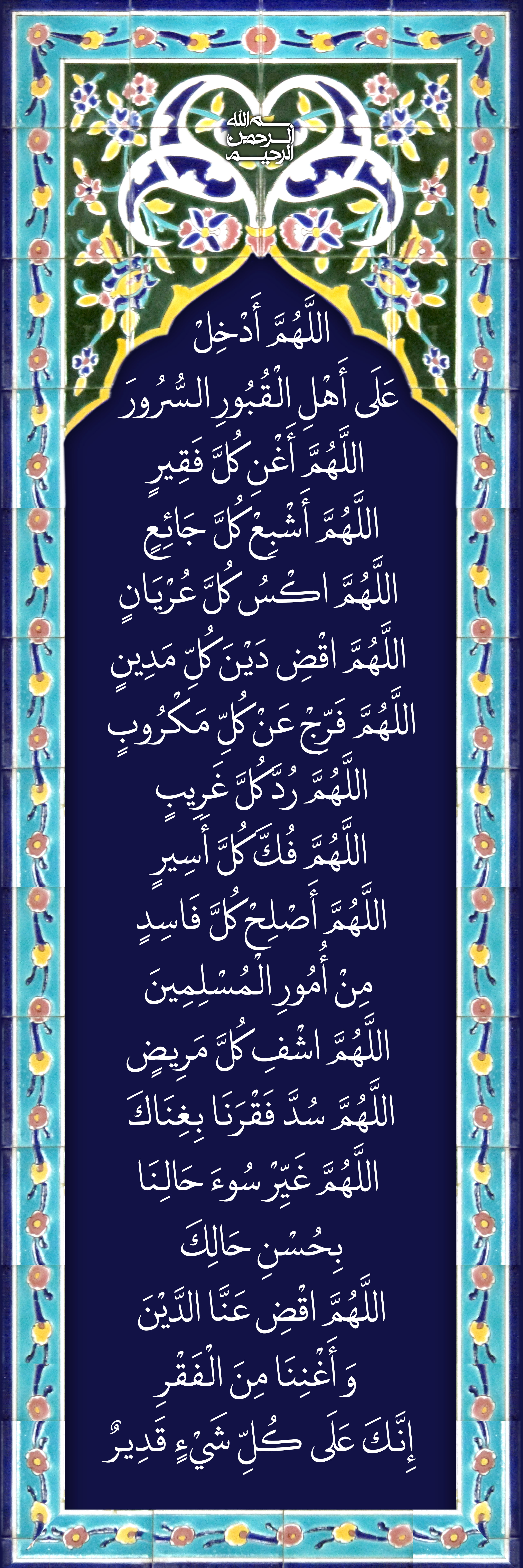 اللَّهُمَّ أَدْخِلْ عَلَى أَهْلِ الْقُبُورِ السُّرُورَ اللَّهُمَّ أَغْنِ کُلَّ فَقِیرٍ اللَّهُمَّ أَشْبِعْ کُلَّ جَائِعٍ اللَّهُمَّ اکْسُ کُلَّ عُرْیَانٍ اللَّهُمَّ اقْضِ دَیْنَ کُلِّ مَدِینٍ اللَّهُمَّ فَرِّجْ عَنْ کُلِّ مَکْرُوبٍ اللَّهُمَّ رُدَّ کُلَّ غَرِیبٍ اللَّهُمَّ فُکَّ کُلَّ أَسِیرٍ اللَّهُمَّ أَصْلِحْ کُلَّ فَاسِدٍ مِنْ أُمُورِ الْمُسْلِمِینَ اللَّهُمَّ اشْفِ کُلَّ مَرِیضٍ اللَّهُمَّ سُدَّ فَقْرَنَا بِغِنَاکَ اللَّهُمَّ غَیِّرْ سُوءَ حَالِنَا بِحُسْنِ حَالِکَ اللَّهُمَّ اقْضِ عَنَّا الدَّیْنَ وَ أَغْنِنَا مِنَ الْفَقْرِ إِنَّکَ عَلَى کُلِّ شَیْءٍ قَدِیرٌ .