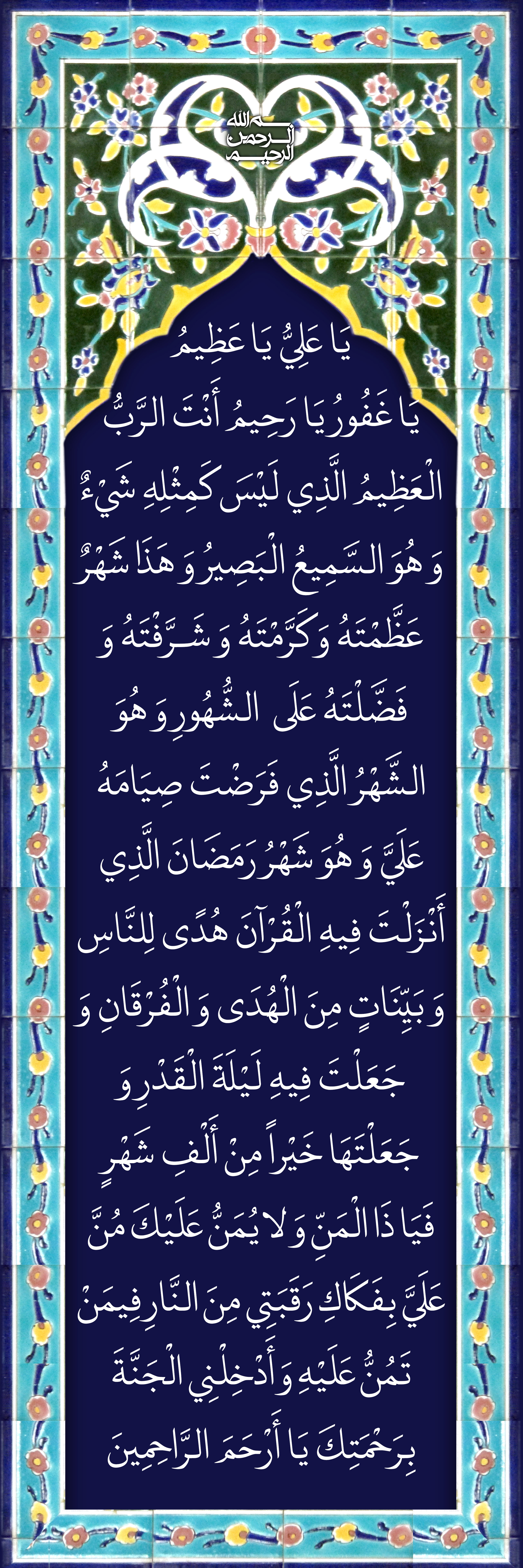 یَا عَلِیُّ یَا عَظِیمُ یَا غَفُورُ یَا رَحِیمُ أَنْتَ الرَّبُّ الْعَظِیمُ الَّذِی لَیْسَ کَمِثْلِهِ شَیْءٌ وَ هُوَ السَّمِیعُ الْبَصِیرُ وَ هَذَا شَهْرٌ عَظَّمْتَهُ وَ کَرَّمْتَهُ وَ شَرَّفْتَهُ وَ فَضَّلْتَهُ عَلَى الشُّهُورِ وَ هُوَ الشَّهْرُ الَّذِی فَرَضْتَ صِیَامَهُ عَلَیَّ وَ هُوَ شَهْرُ رَمَضَانَ الَّذِی أَنْزَلْتَ فِیهِ الْقُرْآنَ هُدًى لِلنَّاسِ وَ بَیِّنَاتٍ مِنَ الْهُدَى وَ الْفُرْقَانِ وَ جَعَلْتَ فِیهِ لَیْلَةَ الْقَدْرِ وَ جَعَلْتَهَا خَیْرا مِنْ أَلْفِ شَهْرٍ فَیَا ذَا الْمَنِّ وَ لا یُمَنُّ عَلَیْکَ مُنَّ عَلَیَّ بِفَکَاکِ رَقَبَتِی مِنَ النَّارِ فِیمَنْ تَمُنُّ عَلَیْهِ وَ أَدْخِلْنِی الْجَنَّةَ بِرَحْمَتِکَ یَا أَرْحَمَ الرَّاحِمِینَ